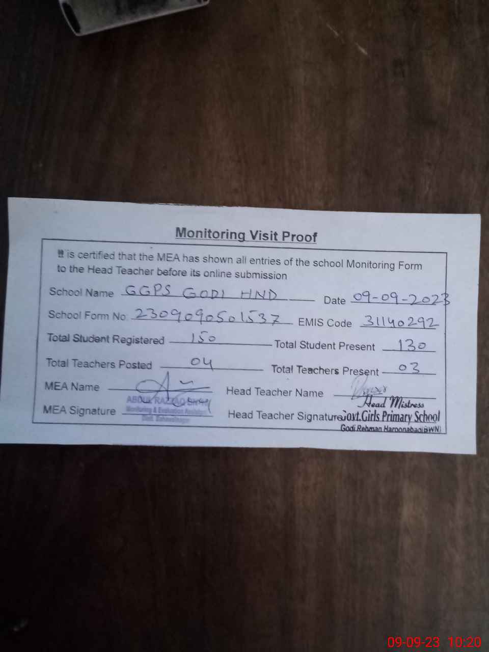 | Attendance Register | Head Teacher | MEA with School | Visit Proof |