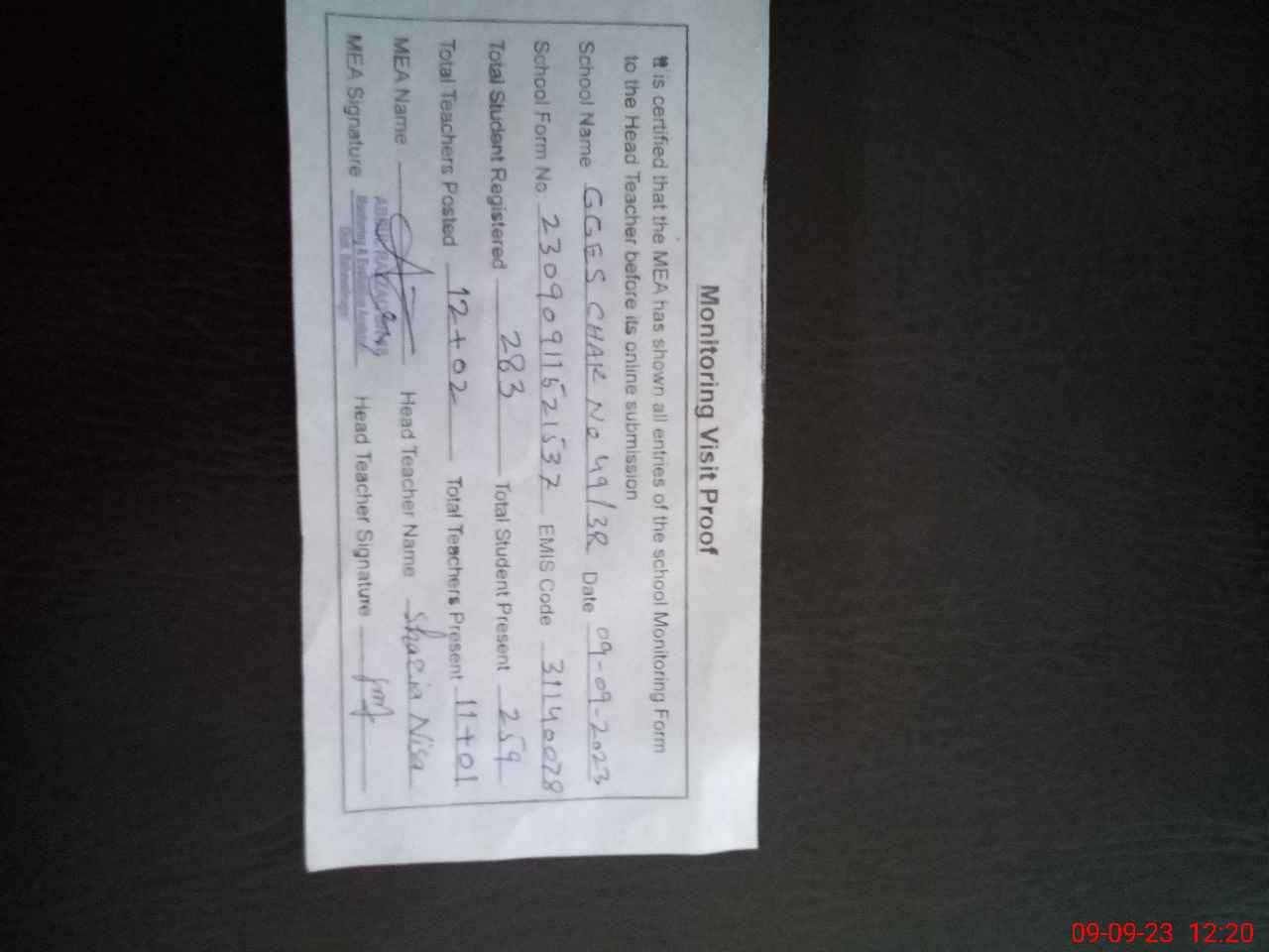 | Attendance Register | Head Teacher | MEA with School | Visit Proof |