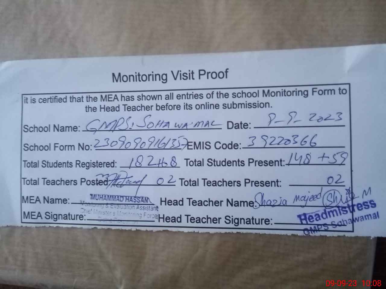 | Attendance Register | Head Teacher | MEA with School | Visit Proof |