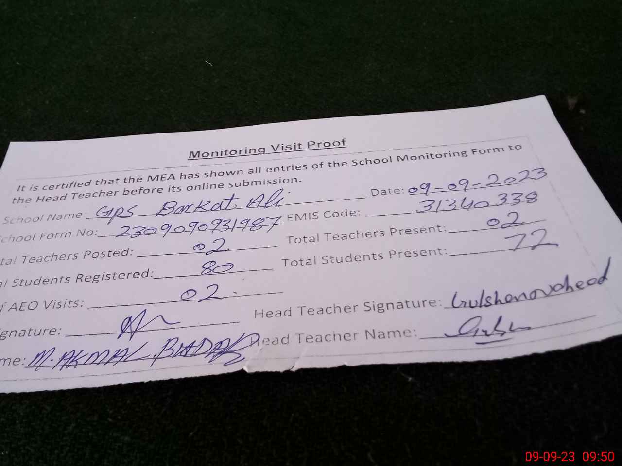 | Attendance Register | Head Teacher | MEA with School | Visit Proof |