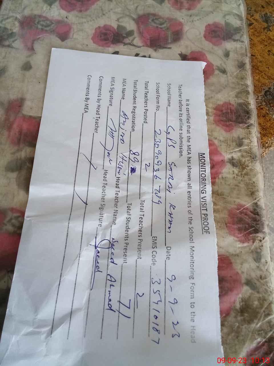 | Attendance Register | Head Teacher | MEA with School | Visit Proof |