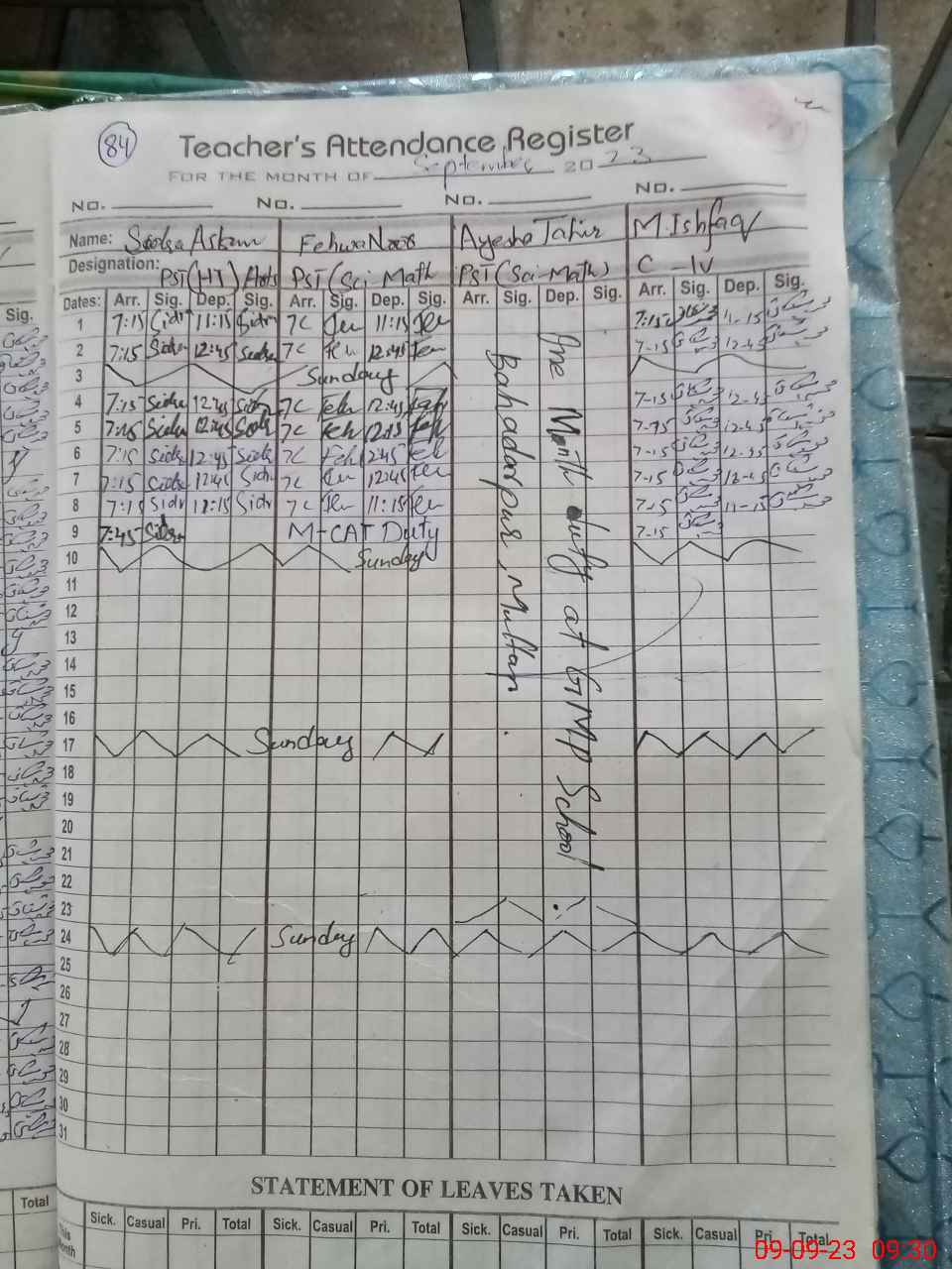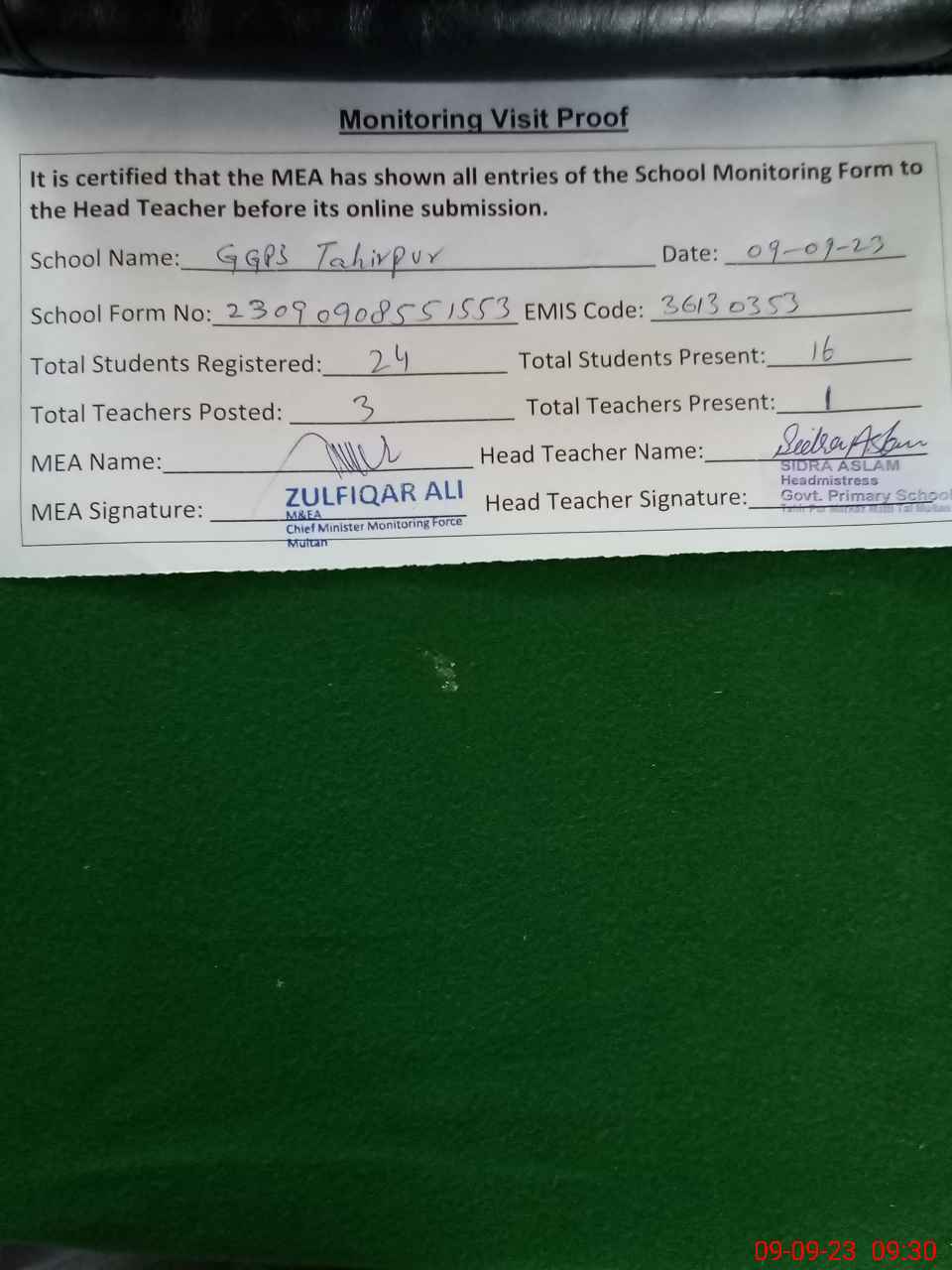 | Monitoring Date: 09-09-2023 | Start Time: 09-09-2023 08:55 AM | End Time: 09-09-2023 09:31 AM | Name of MEA: Zu**** Al**** | |