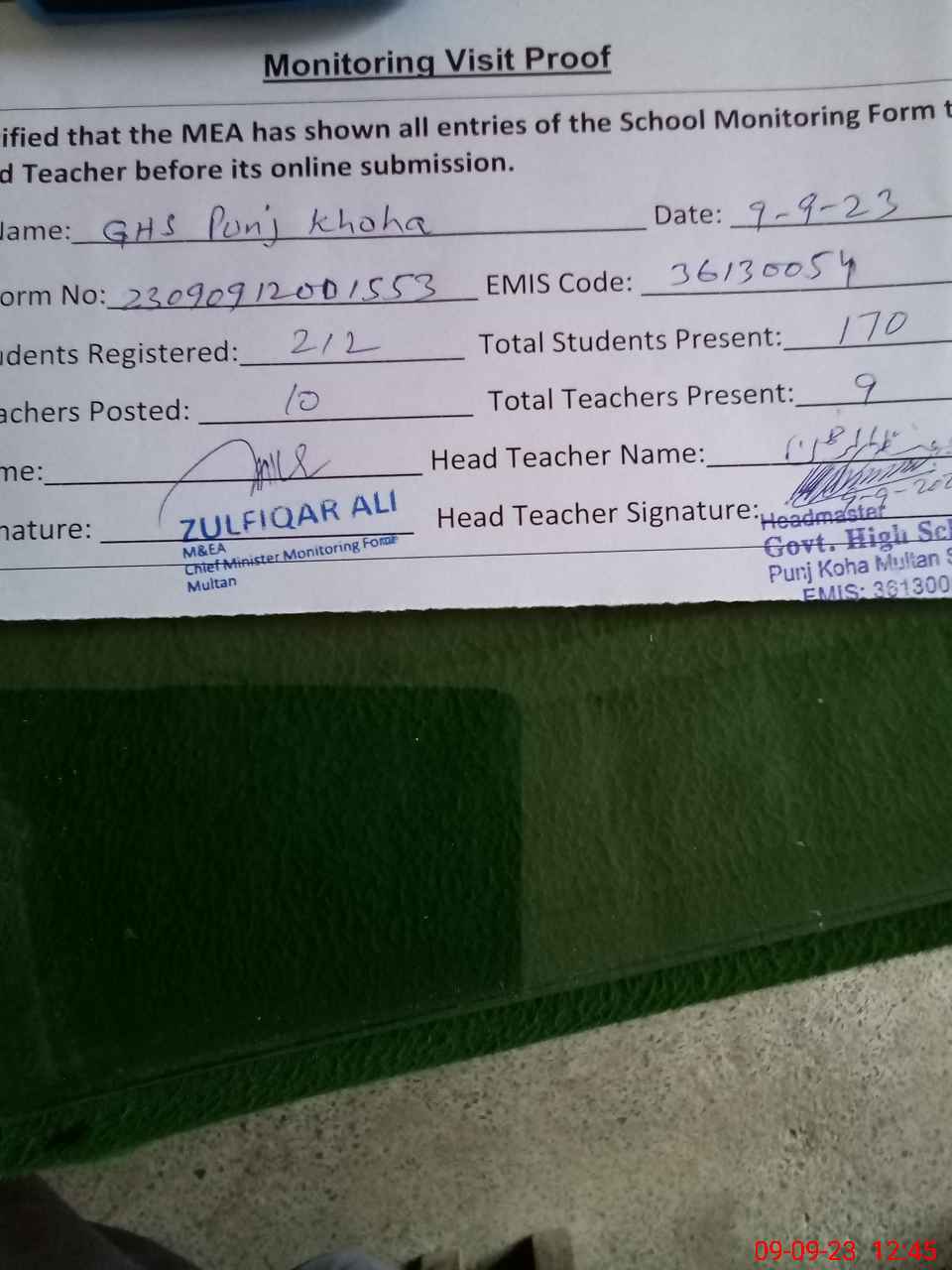 | EMIS Code: 36130054 | Name of School: GHS PUNJ KOHA MULTAN | |||