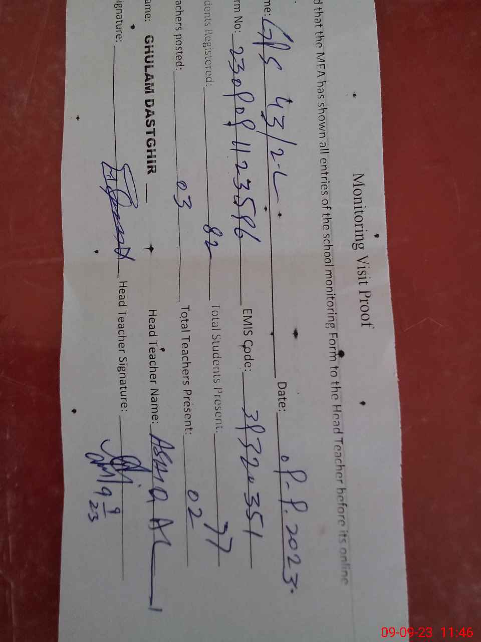 | Attendance Register | Head Teacher | MEA with School | Visit Proof |