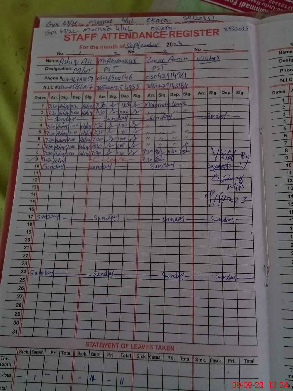 | CNIC | Full Name | Designation | R/C | Absence During Last Calender Month |