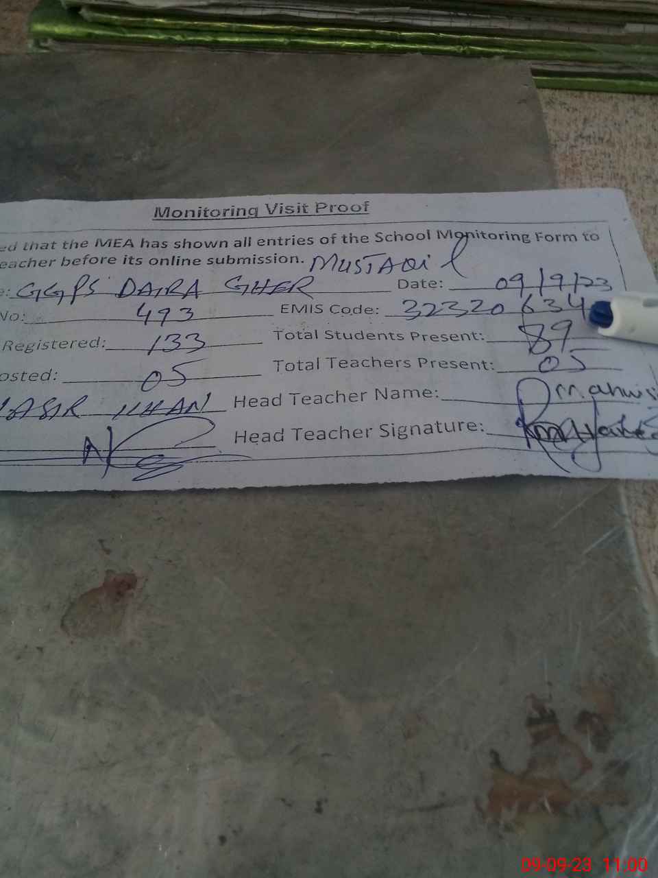 | Attendance Register | Head Teacher | MEA with School | Visit Proof |