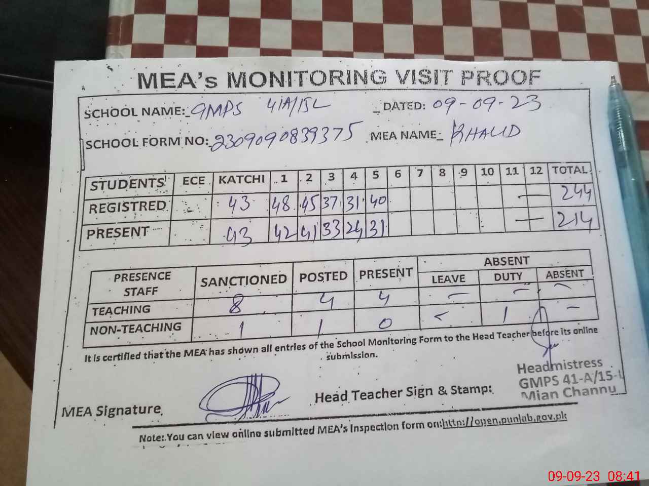 | EMIS Code: 36430291 | Name of School: GMPS 41-A/15-L, MIAN CHANNU | |||