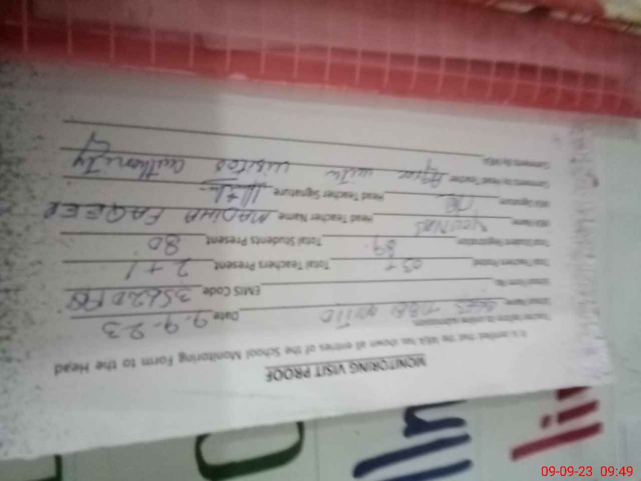 | Attendance Register | Head Teacher | MEA with School | Visit Proof |
