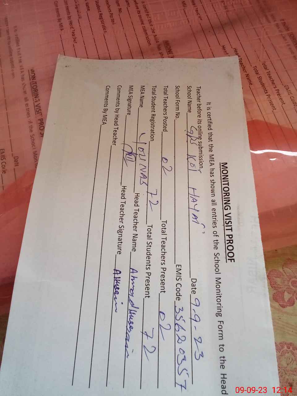 | Attendance Register | Head Teacher | MEA with School | Visit Proof |