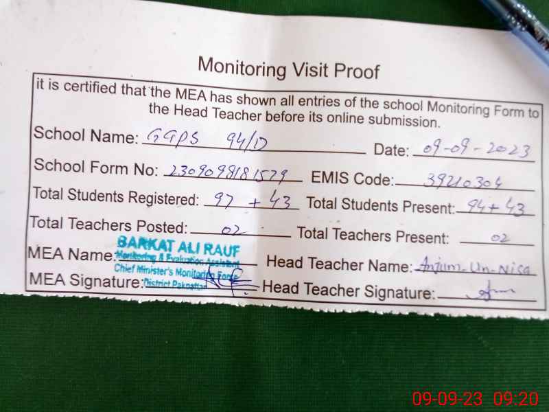 | EMIS Code: 39210304 | Name of School: GGPS 94 D | |||