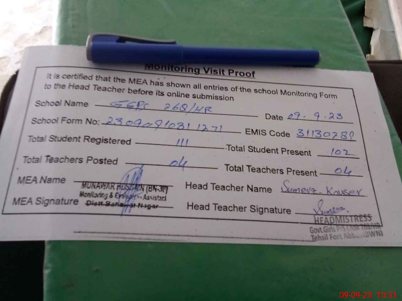 | Attendance Register | Head Teacher | MEA with School | Visit Proof |