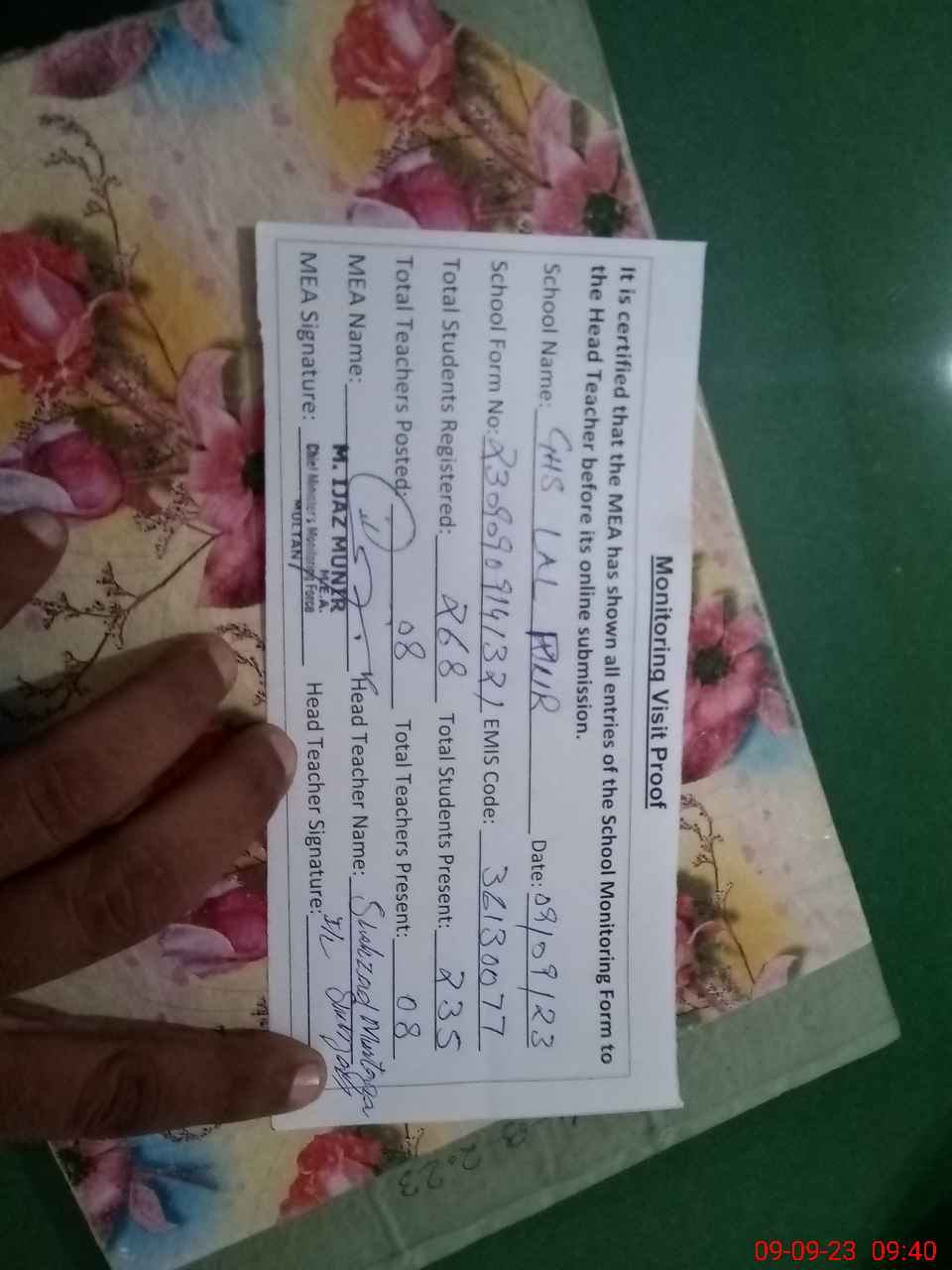| Attendance Register | Head Teacher | MEA with School | Visit Proof |