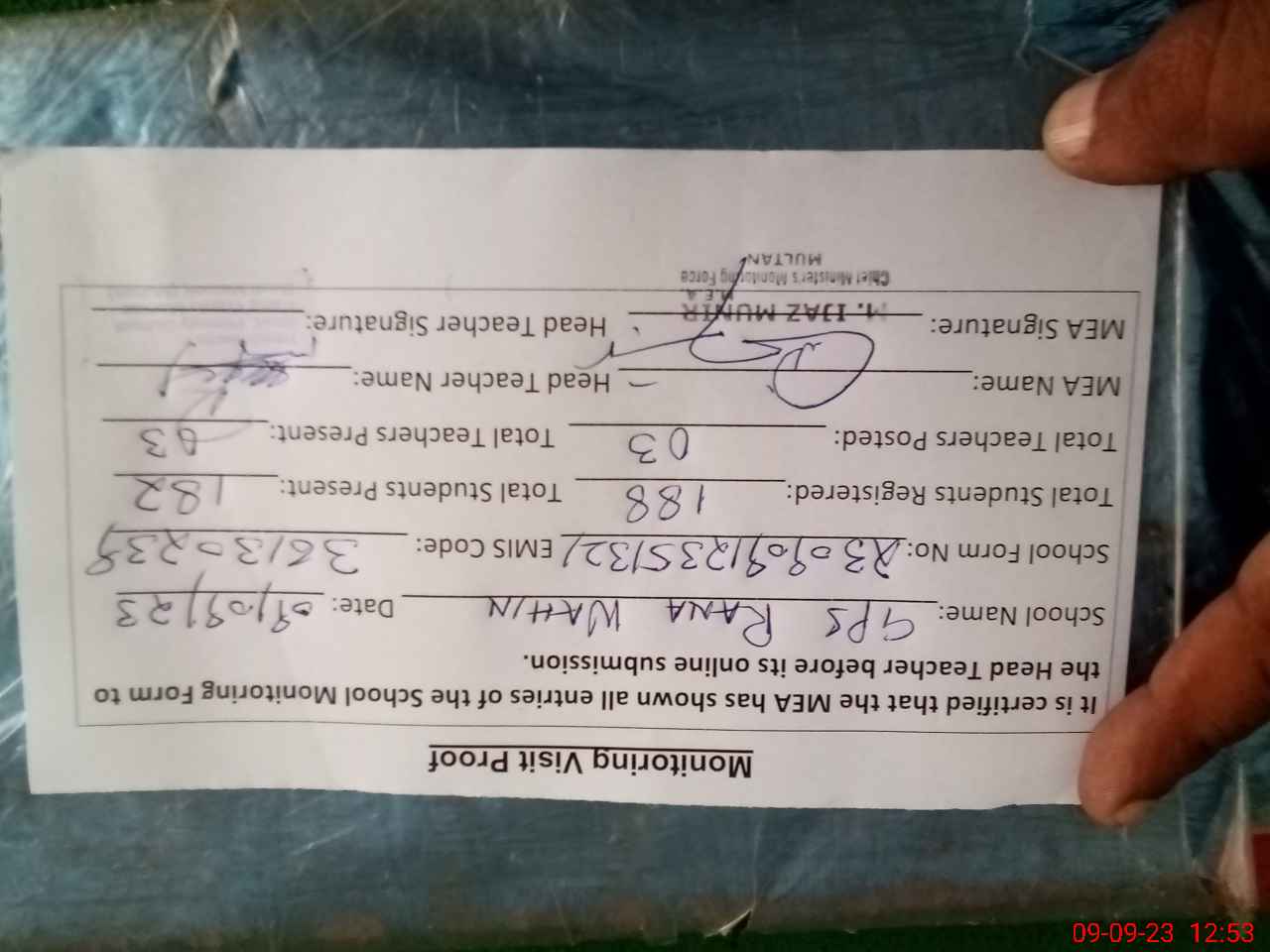 | Attendance Register | Head Teacher | MEA with School | Visit Proof |
