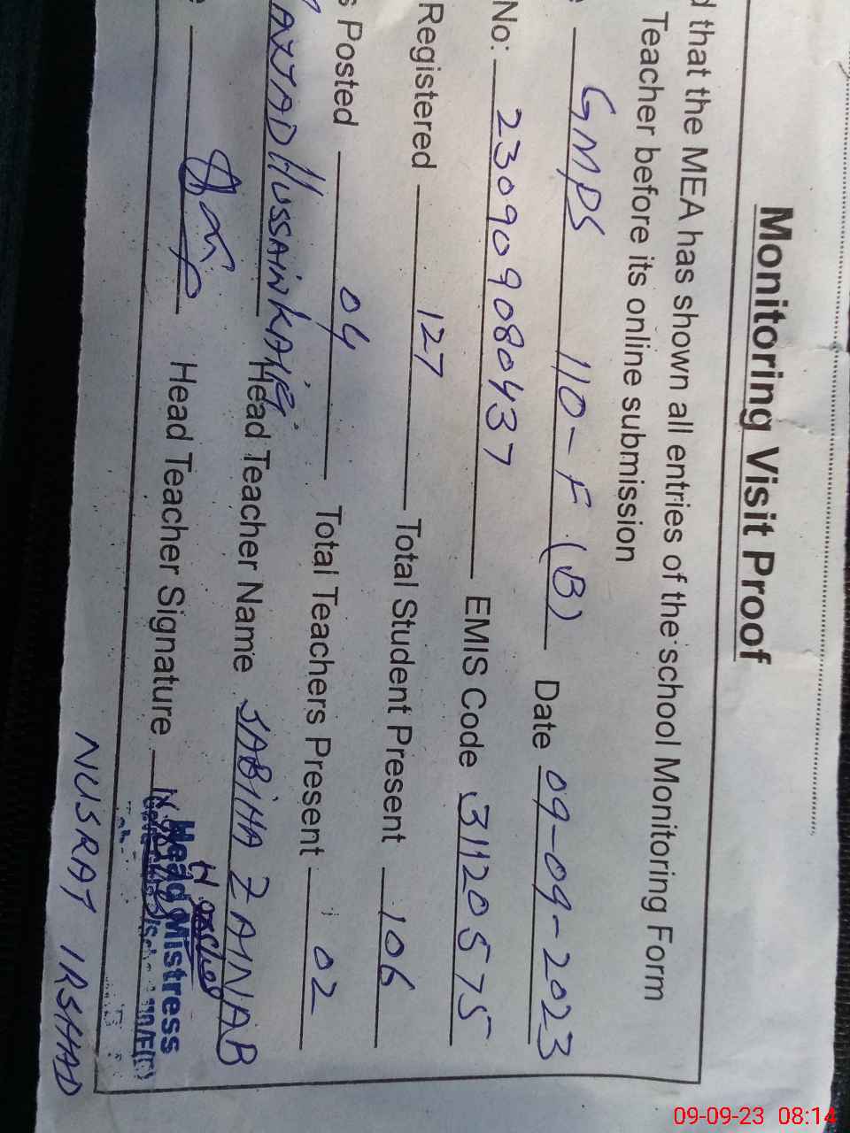 | EMIS Code: 31120575 | Name of School: GMPS CHAK NO.110 FATEH (B) | |||