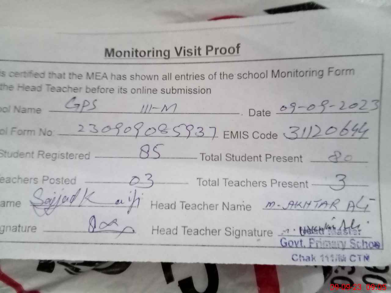 | Attendance Register | Head Teacher | MEA with School | Visit Proof |