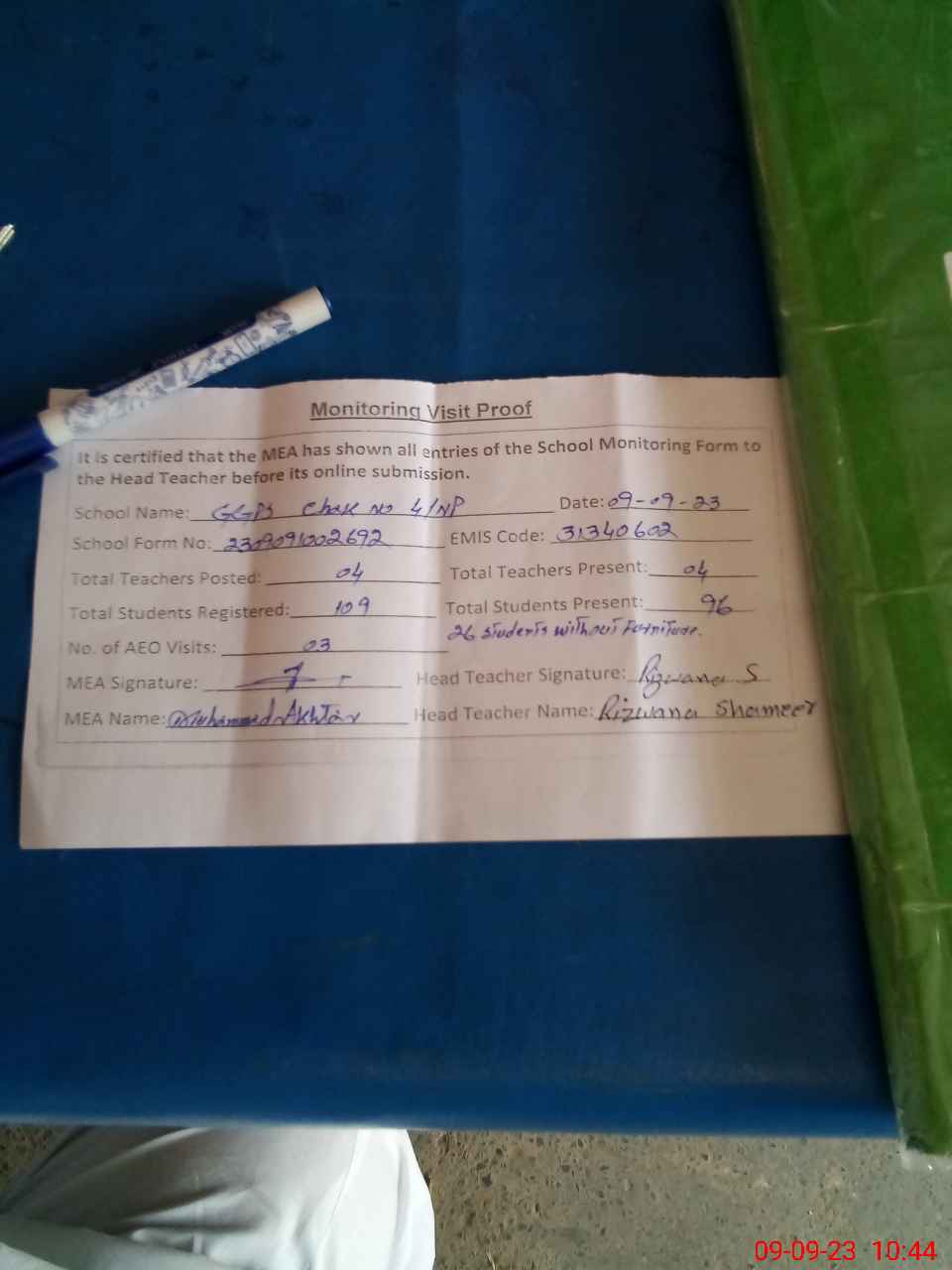 | Attendance Register | Head Teacher | MEA with School | Visit Proof |