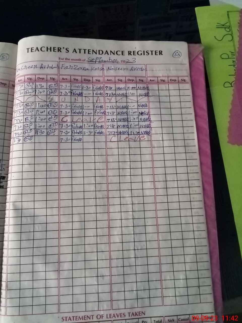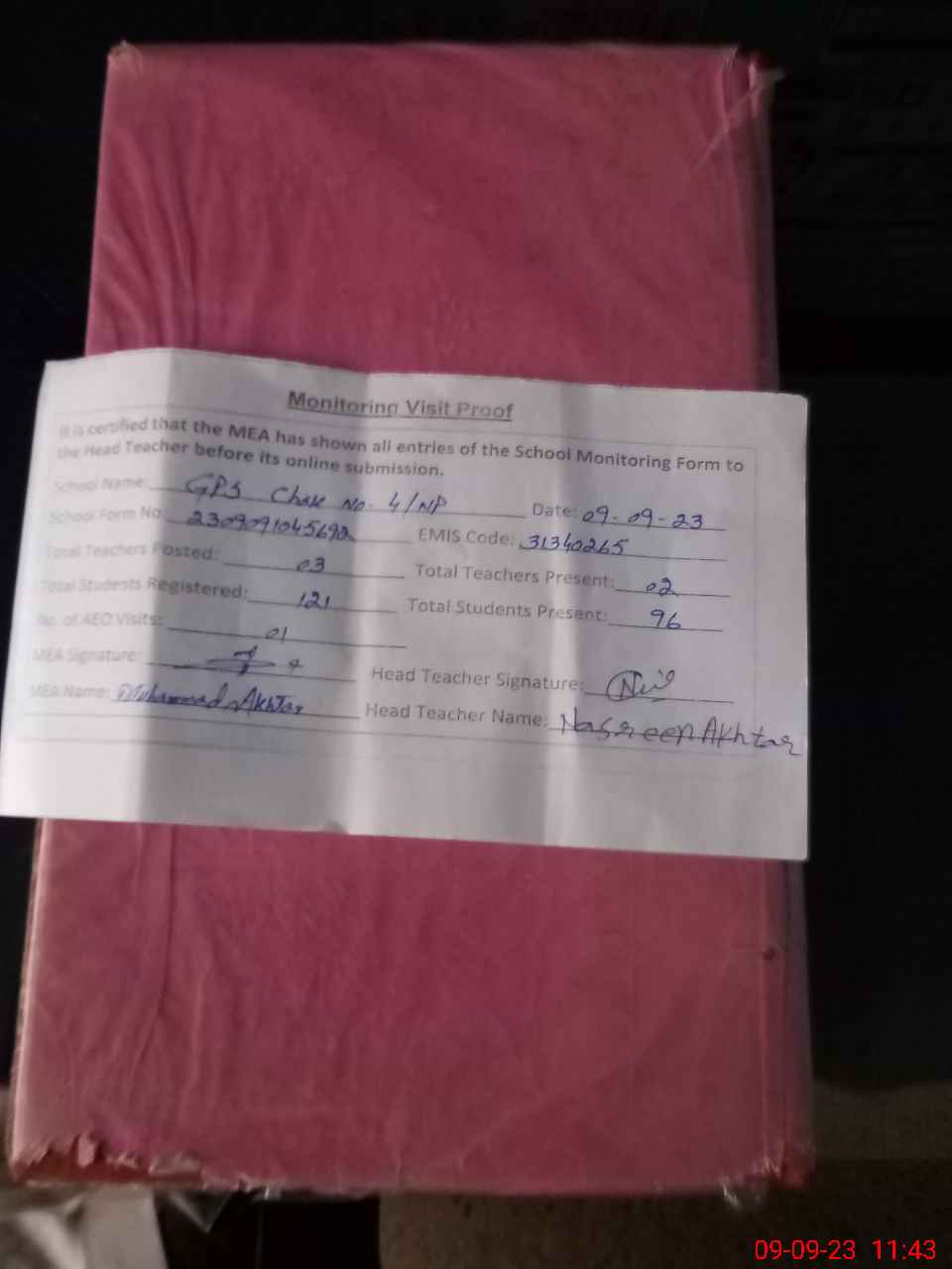 | Attendance Register | Head Teacher | MEA with School | Visit Proof |