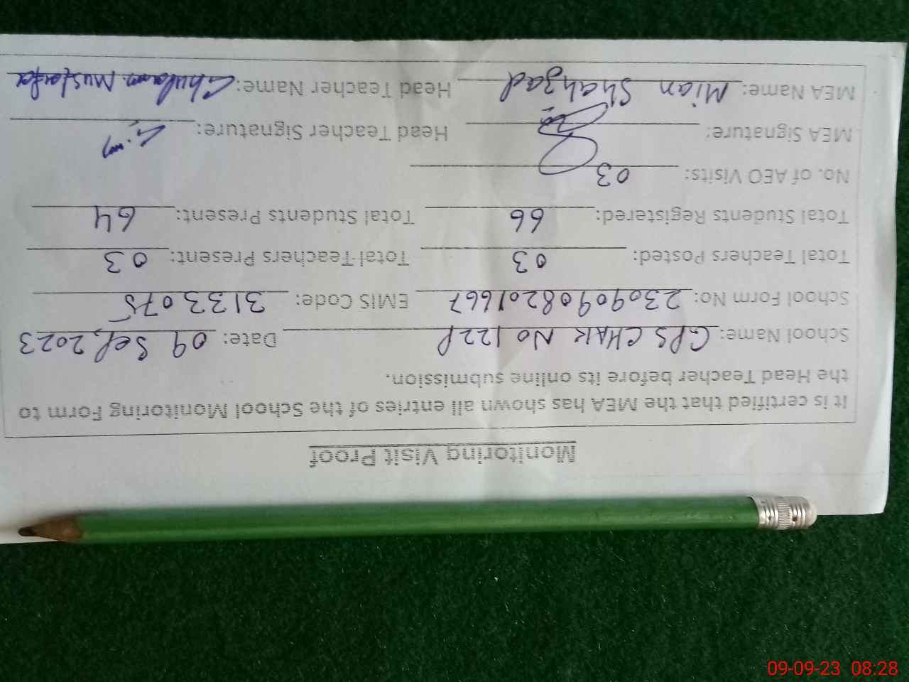 | Attendance Register | Head Teacher | MEA with School | Visit Proof |