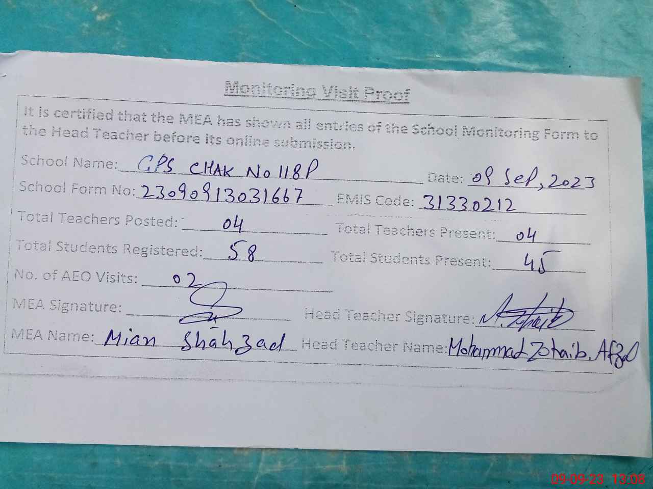 | Attendance Register | Head Teacher | MEA with School | Visit Proof |