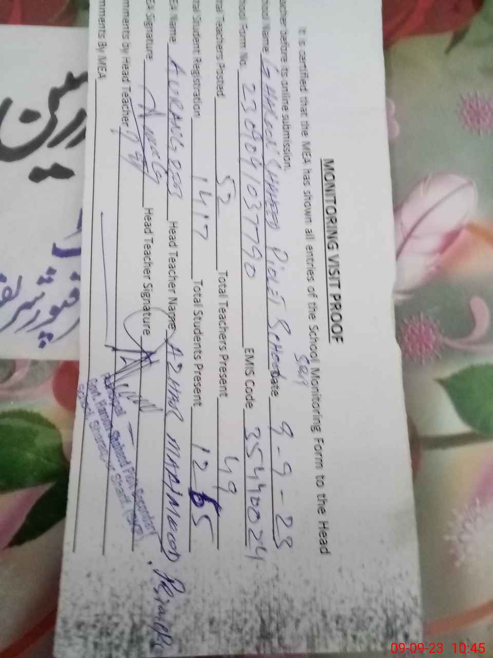 | Attendance Register | Head Teacher | MEA with School | Visit Proof |