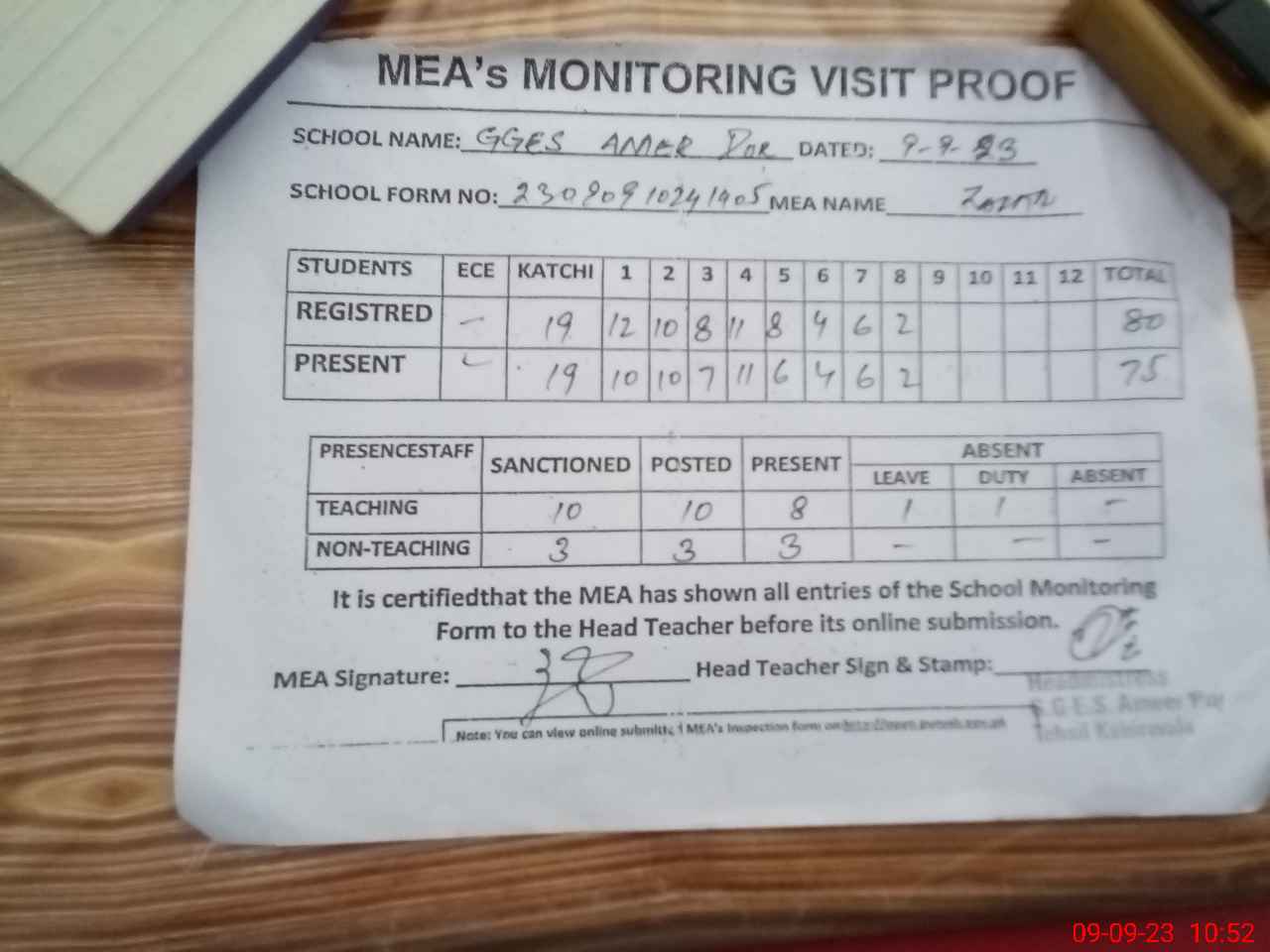 | Attendance Register | Head Teacher | MEA with School | Visit Proof |