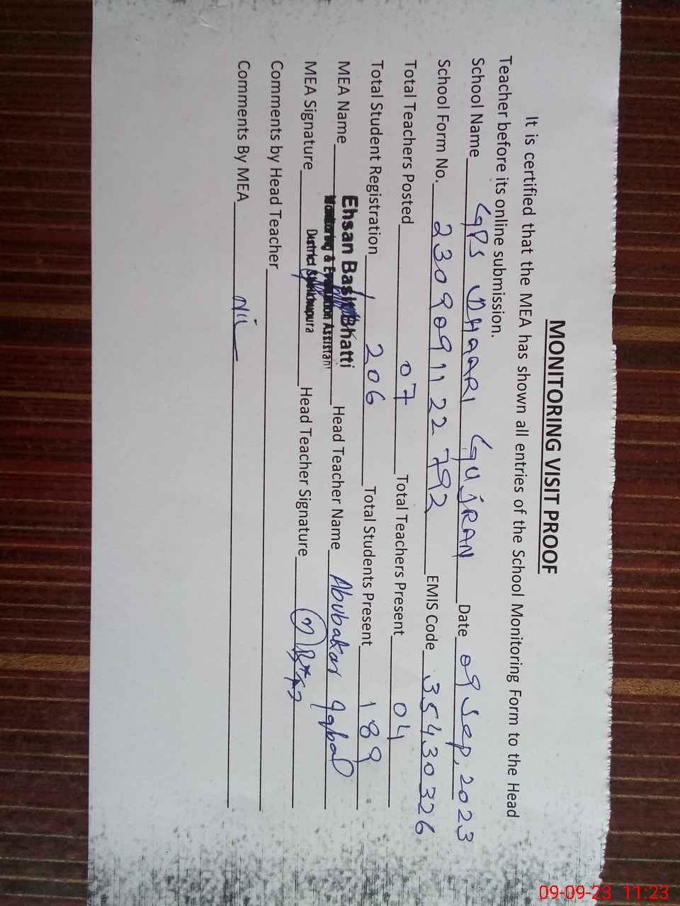 | Attendance Register | Head Teacher | MEA with School | Visit Proof |