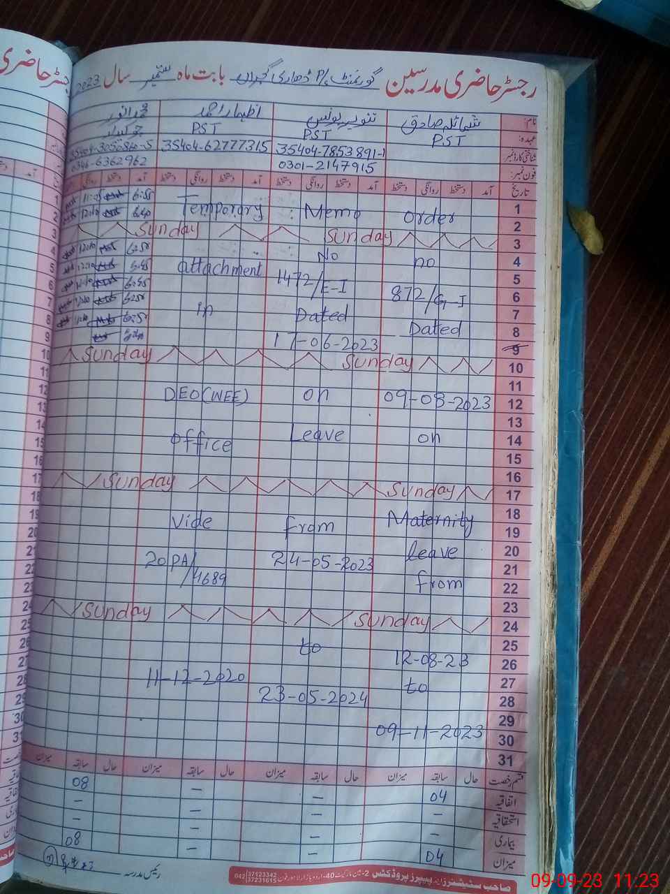 | 61**** | Mu**** Am**** Kh**** | PST | Temporary | 0 | 0 | 0 | 0 | 0 | 0 | 0 | 0 | 0 | Maternity |