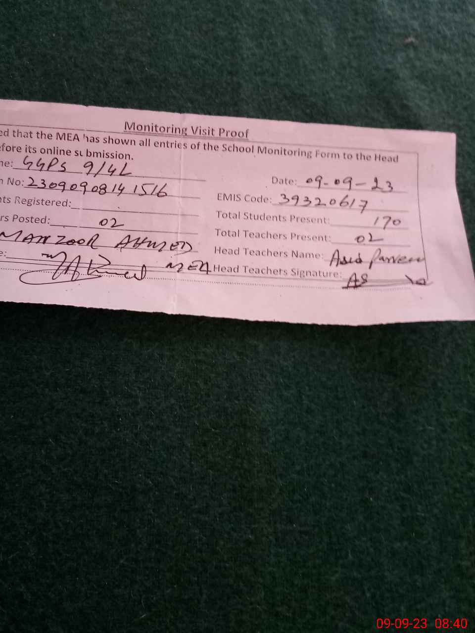 | Attendance Register | Head Teacher | MEA with School | Visit Proof |