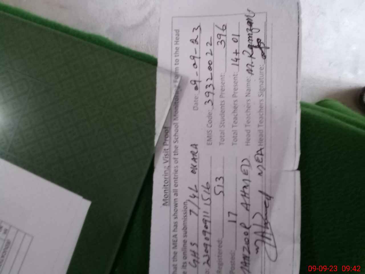 | Attendance Register | Head Teacher | MEA with School | Visit Proof |