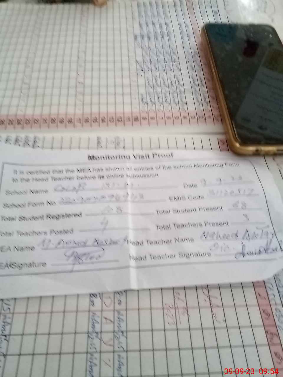 | Attendance Register | Head Teacher | MEA with School | Visit Proof |