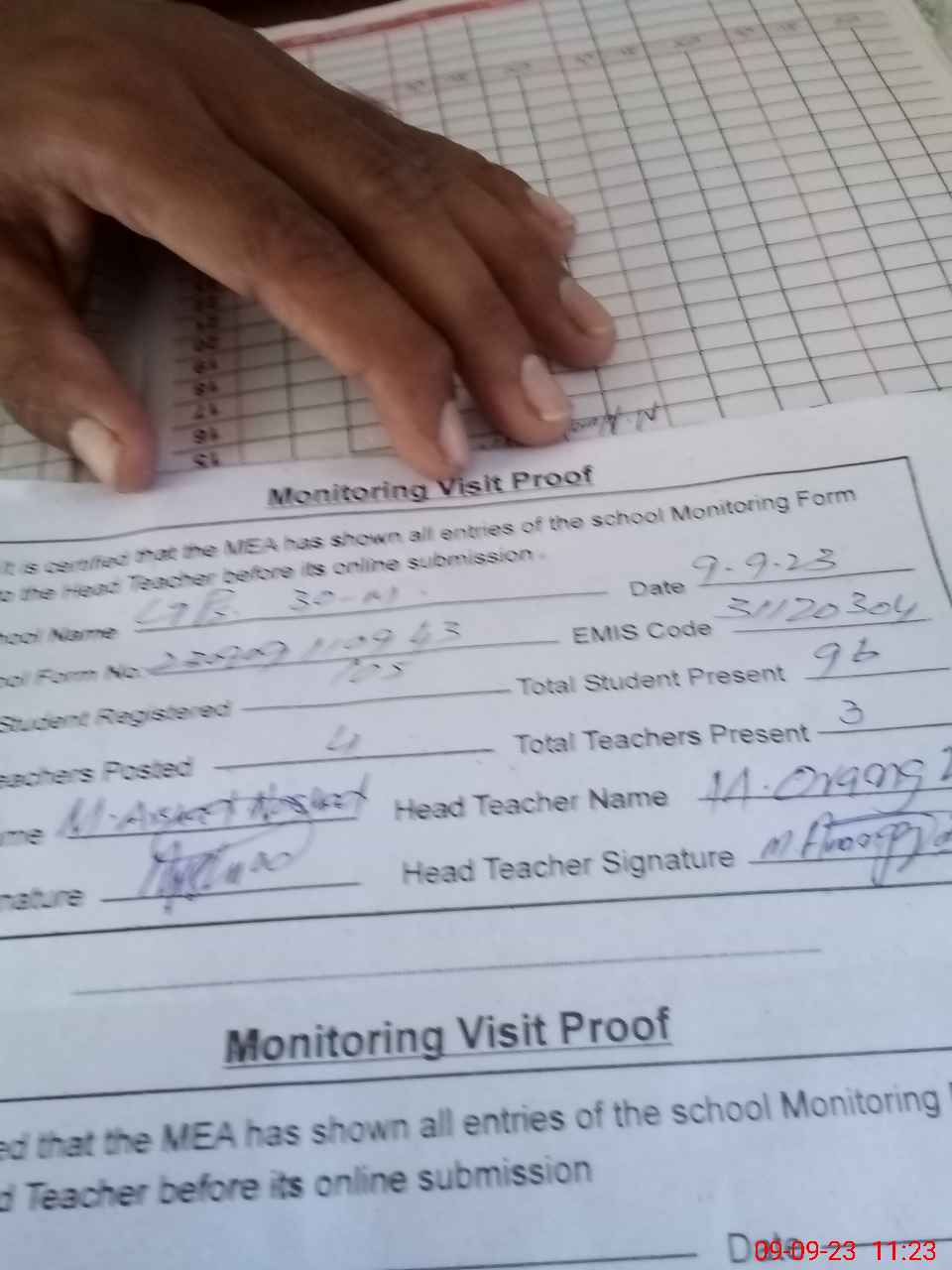 | Attendance Register | Head Teacher | MEA with School | Visit Proof |