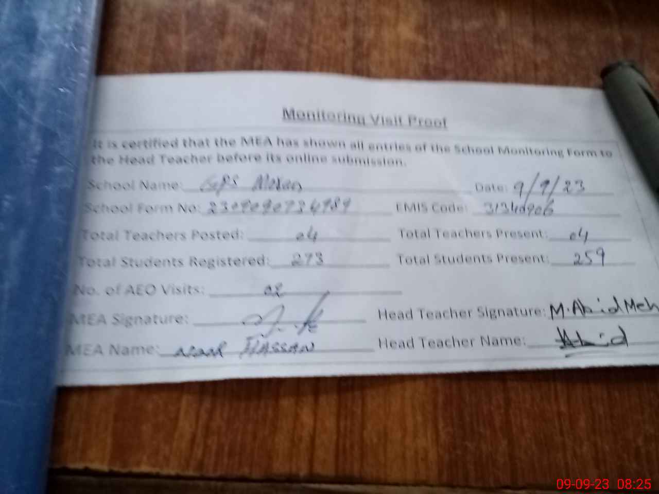 | Attendance Register | Head Teacher | MEA with School | Visit Proof |