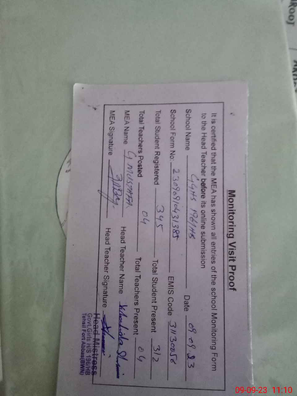 | EMIS Code: 31130056 | Name of School: GGHS CHAK NO 196 HB | |||