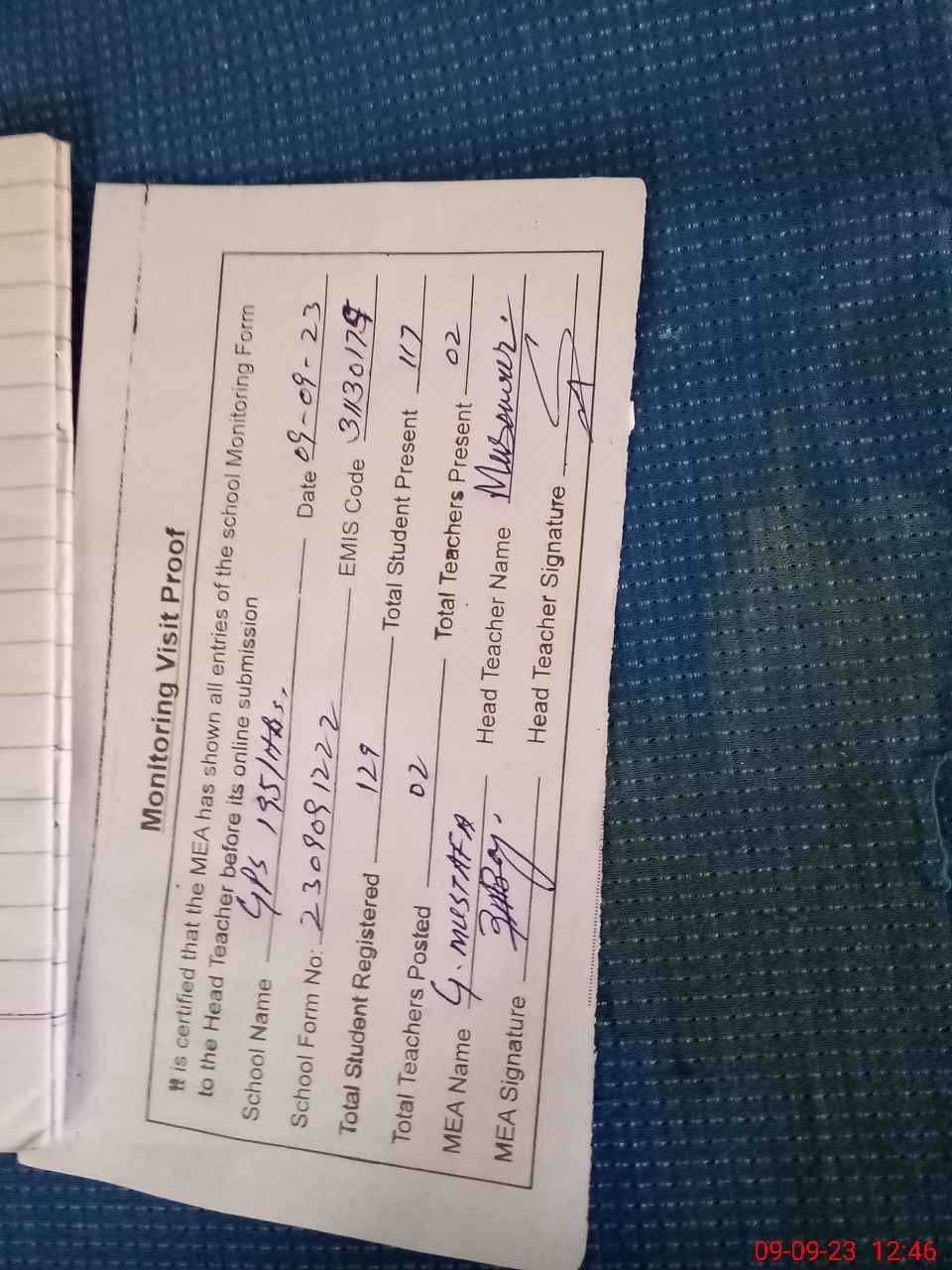 | Attendance Register | Head Teacher | MEA with School | Visit Proof |