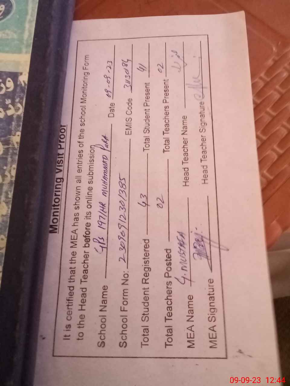 | Attendance Register | Head Teacher | MEA with School | Visit Proof |