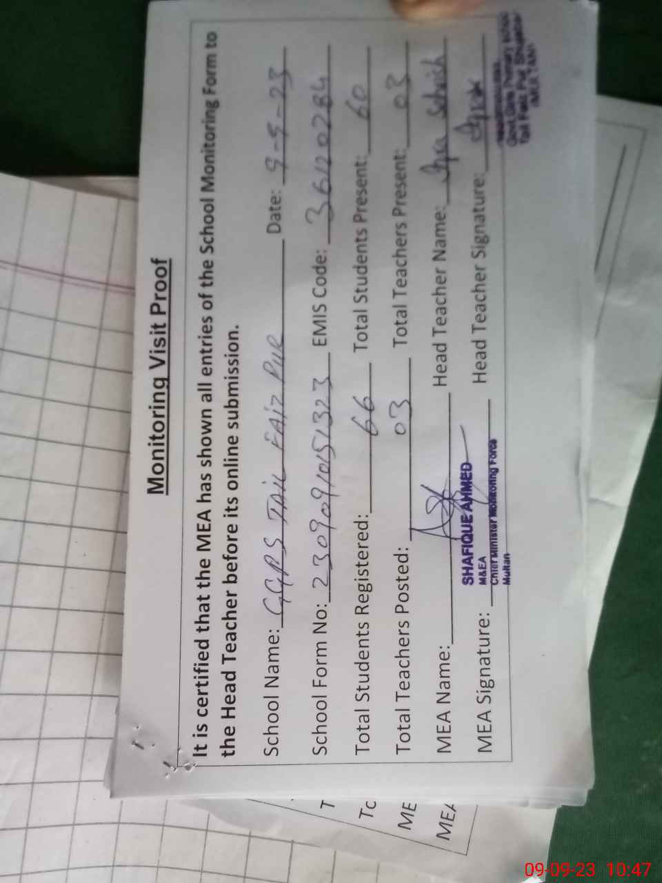 | Attendance Register | Head Teacher | MEA with School | Visit Proof |
