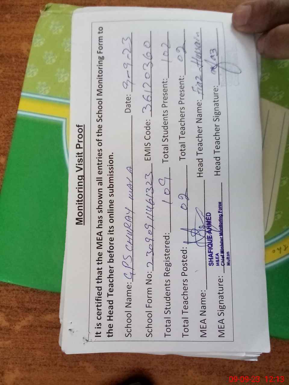 | Attendance Register | Head Teacher | MEA with School | Visit Proof |