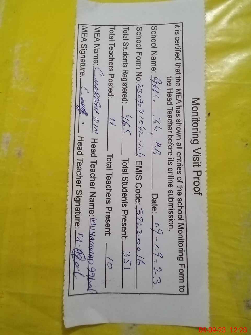 | Attendance Register | Head Teacher | MEA with School | Visit Proof |