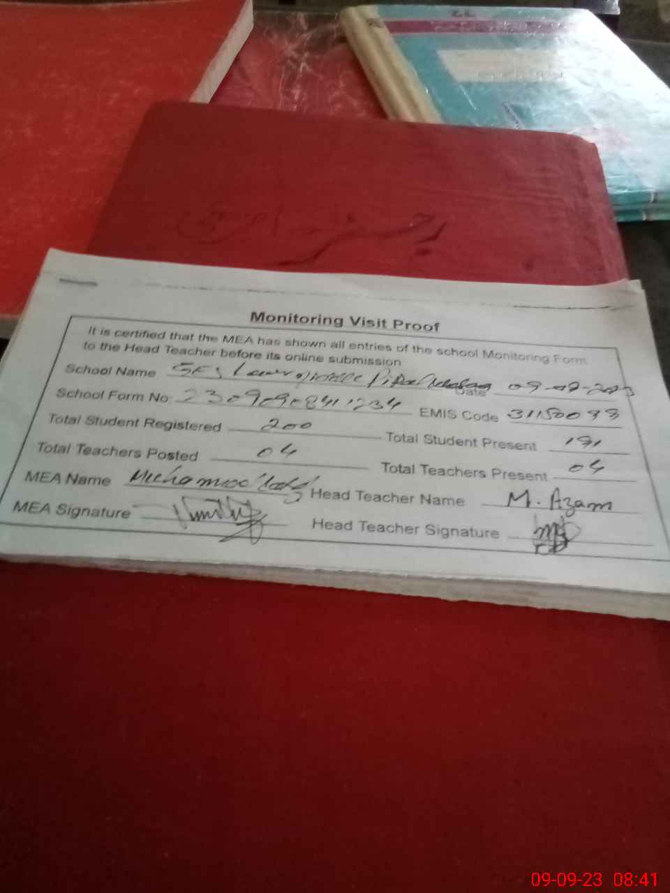 | Attendance Register | Head Teacher | MEA with School | Visit Proof |