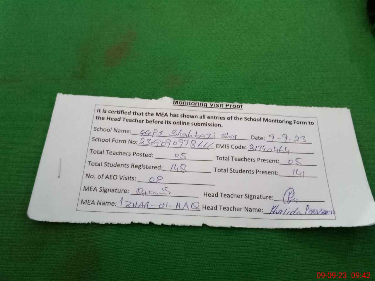 | Attendance Register | Head Teacher | MEA with School | Visit Proof |