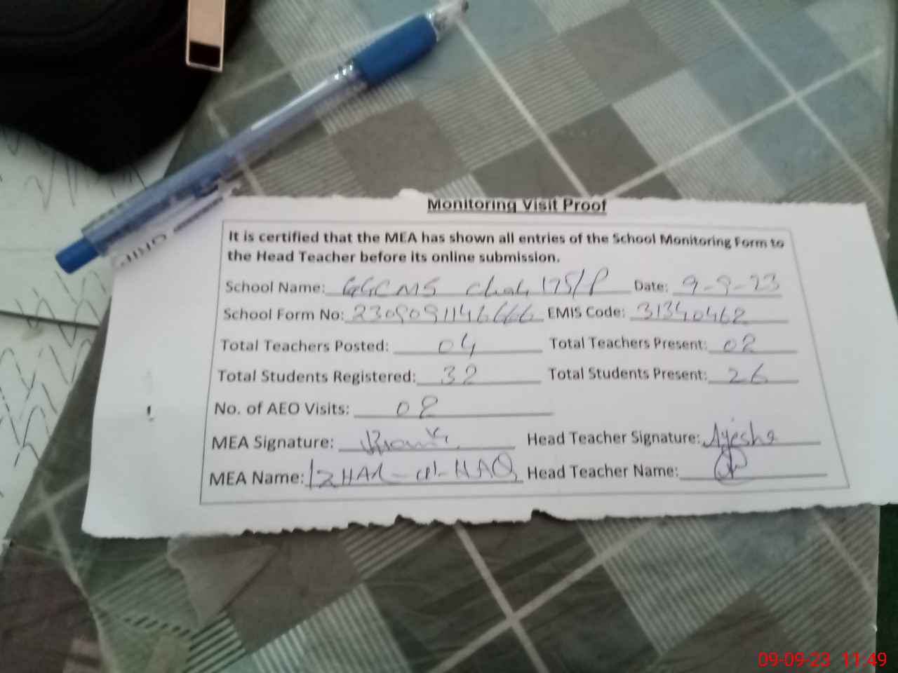 | Monitoring Date: 09-09-2023 | Start Time: 09-09-2023 11:24 AM | End Time: 09-09-2023 11:56 AM | Name of MEA: Mu**** Iz**** UlHa**** | |