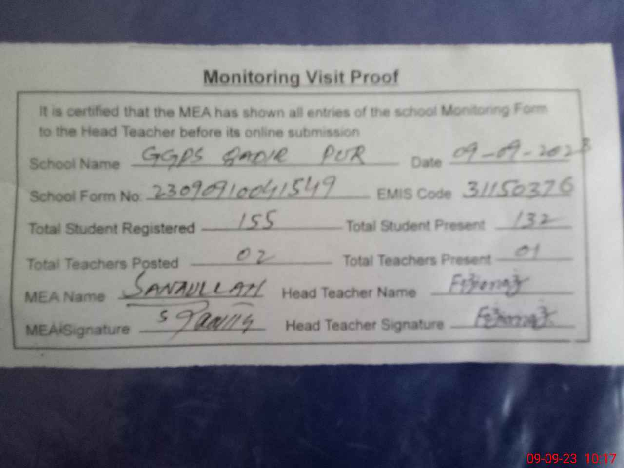 | Attendance Register | Head Teacher | MEA with School | Visit Proof |