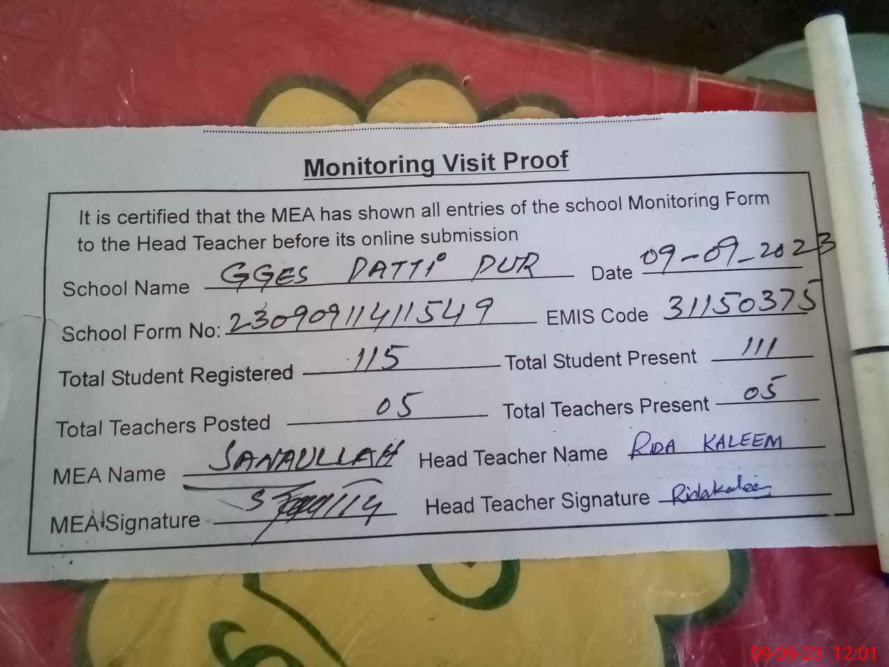 | Attendance Register | Head Teacher | MEA with School | Visit Proof |