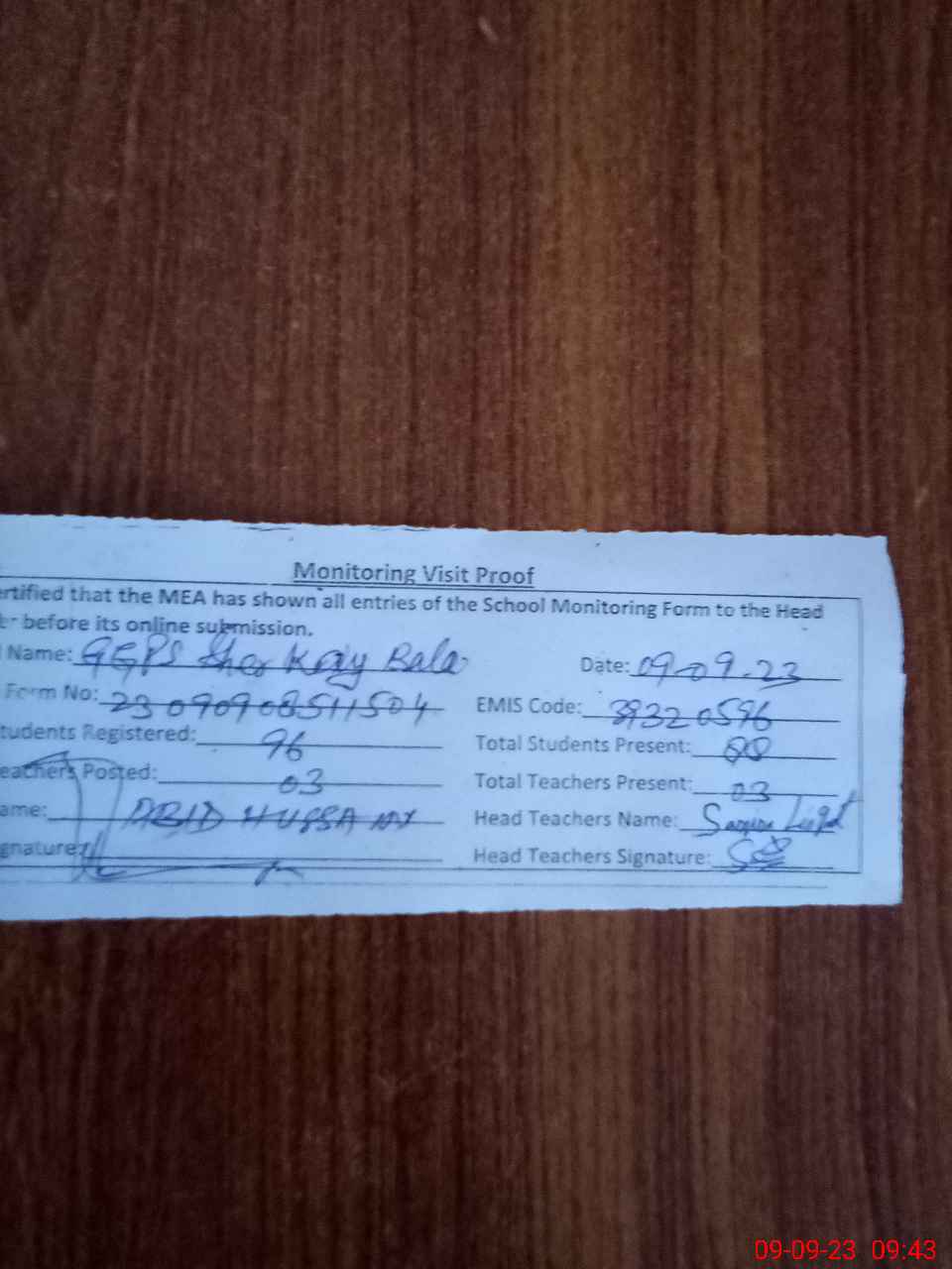 | Attendance Register | Head Teacher | MEA with School | Visit Proof |