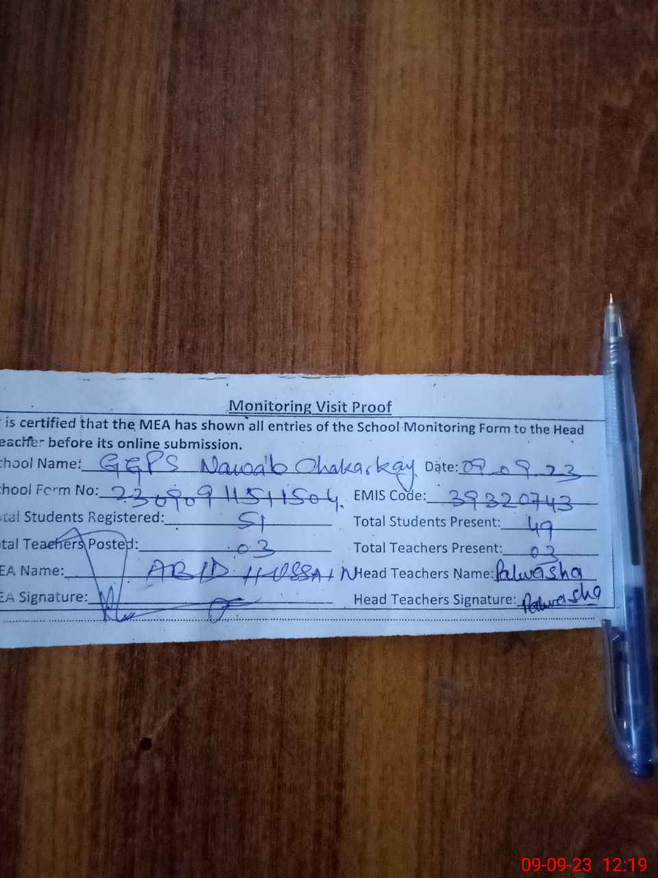 | Attendance Register | Head Teacher | MEA with School | Visit Proof |