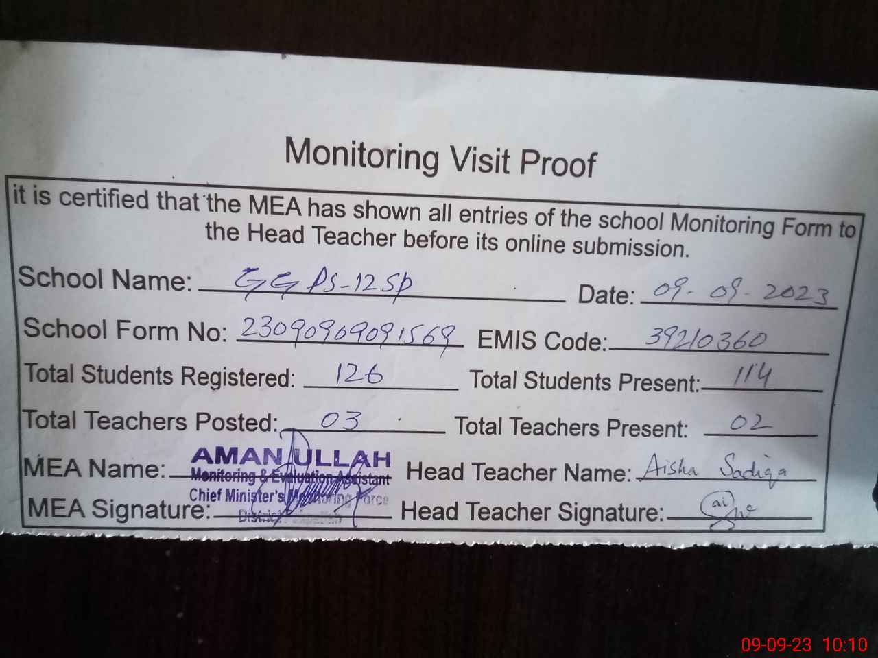 | Attendance Register | Head Teacher | MEA with School | Visit Proof |