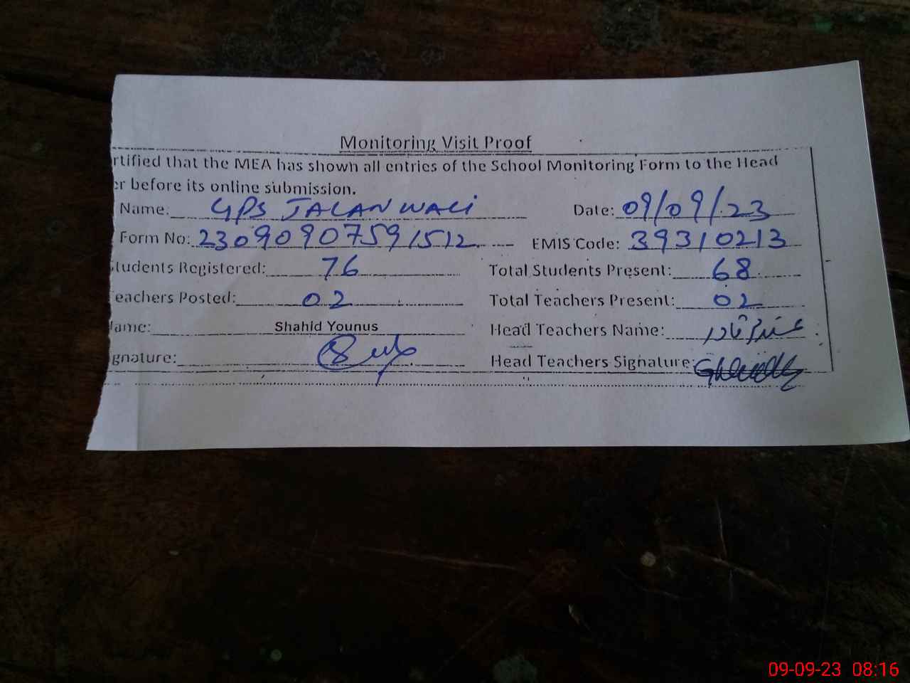 | Attendance Register | Head Teacher | MEA with School | Visit Proof |