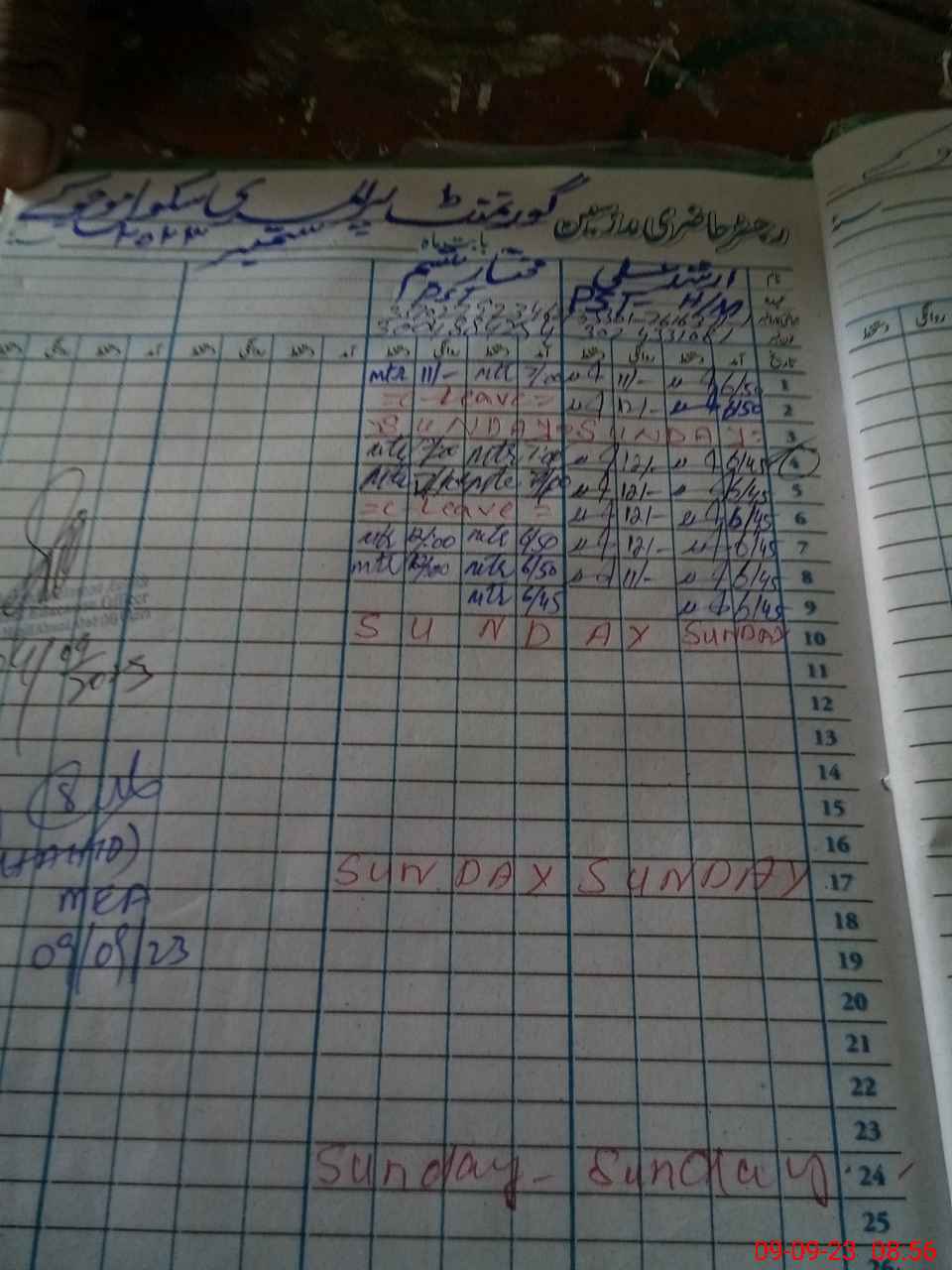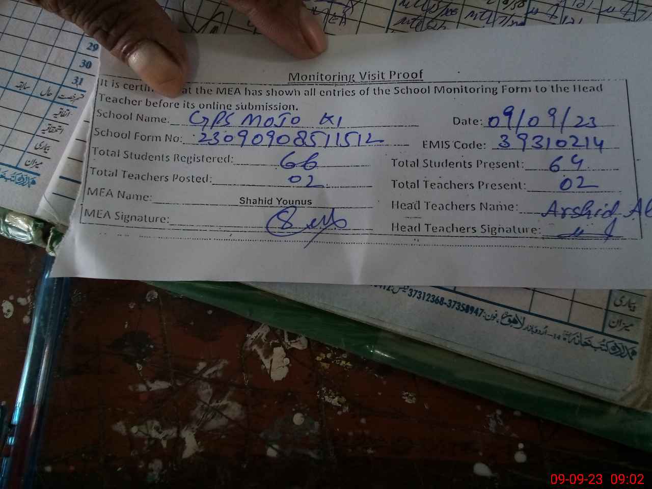 | Attendance Register | Head Teacher | MEA with School | Visit Proof |