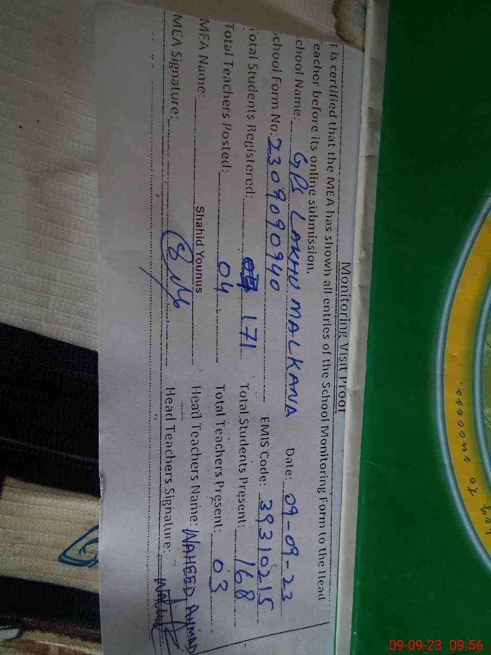 | Certified that this School was Inspected by the Undersigned MEA/DMO Today and the Information Stated Above is as Per Record. | |||||