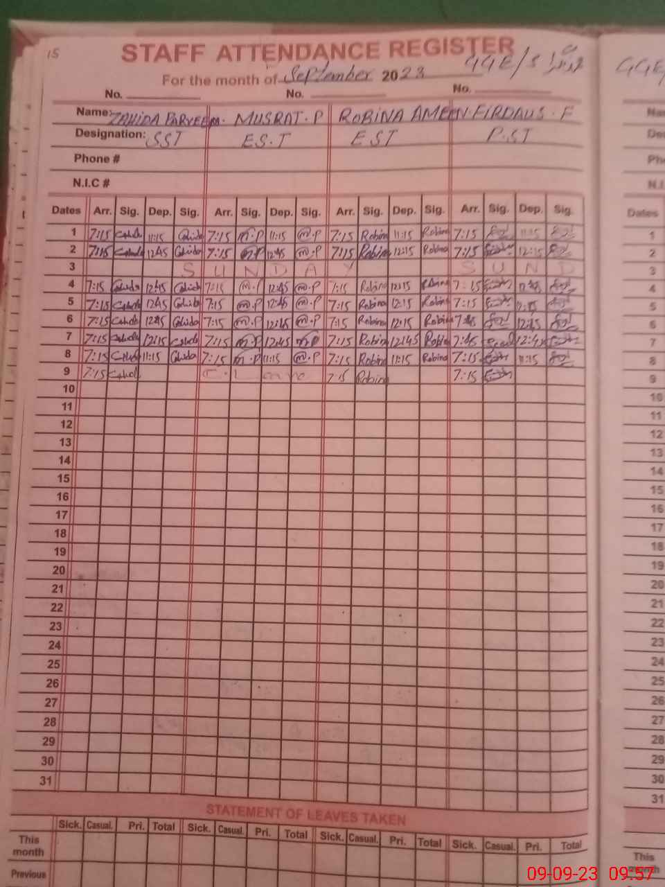 | CNIC | Full Name | Designation | R/C | Absence During Last Calender Month |